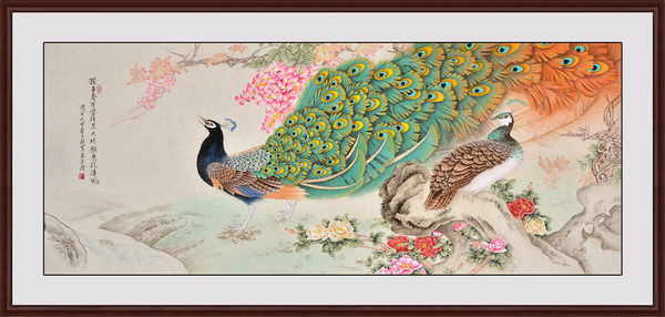 作品分析:从画面来看,这幅孔雀图美而不凡,其色彩处理于浑厚中透出典雅,体现了其富有现代绘画色彩审美理念与效果。气韵生动、形神兼备、笔苍墨韵、雅俗共赏,用笔线条流畅,刚劲有力,两只孔雀在树枝上栖息,雀尾闪烁着迷人的光芒,两只孔雀相互依偎,雌孔雀在雄孔雀的保护下时不时眺望远处的风景,远处的山峰高耸,展现豪迈之气,给人更多的遐思。