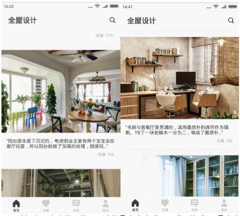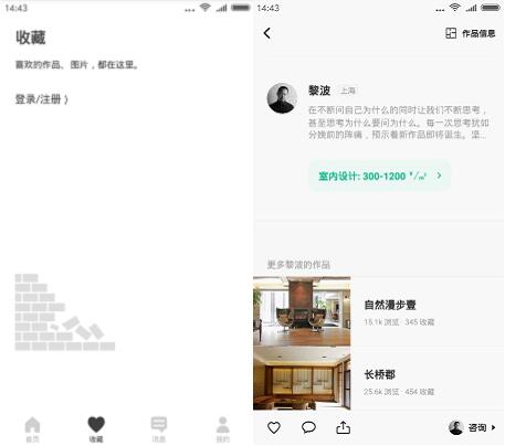功能全面、人性化也是窝牛的一个特点,进入窝牛,底部菜单有首页、收藏、消息和我的四个二级菜单按钮,在主界面还有相关的推介和专题链接,值得一提的是,每一个项目的展示还有收藏数量,用户可以明显的看到热门设计作品,正确把握当下设计的流行趋势。有感兴趣的内容可以随手收藏,下次可直接在“收藏”版块查看。