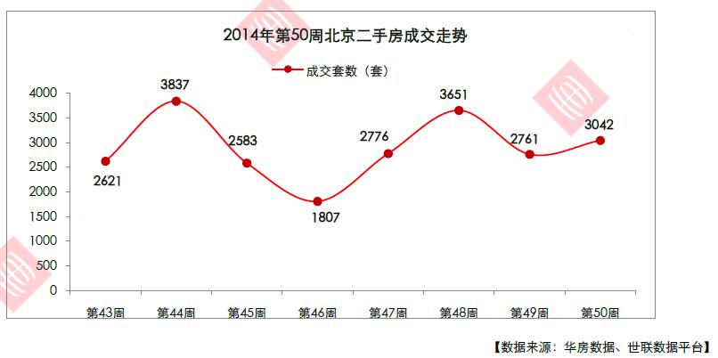 2014年第50周,北京二手房共成交3042套,环比上升10.18%,成交面积27.78万平米,环比上升15.99%。本周市场成交量与上周相比上升。