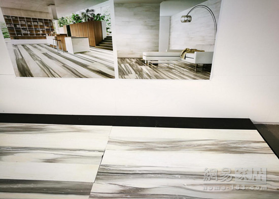 大规格的大薄板瓷砖,3.2米×米,是模仿石材的效果,可以运用到我们的厨房、操作台、桌子,今年非常流行,基本在所有的地方都看到花纹配件,从环保绿色元素,再到几何原理元素,都通过瓷砖展现出来,经过不规则切割再组合一起形成一幅画。