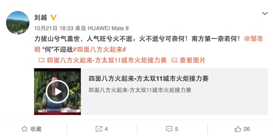 体坛名嘴刘越是南线战队的队长,他喊出的口号是“接力不凡,越传越火“,微博上更是不掩其夺冠的雄心,向其他战队喊话称”力拔山兮气盖世,人气旺兮火不逝。火不势兮可奈何,南方第一奈若何!“并艾特邹市明称,“何”不迎战。