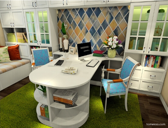 尚品宅配设计师运用房间的柱量位做成两边相接的柜体,形成宽敞的休息区。紫与绿的颜色搭配尽显异国风情。利用书房的转角位,打造一个书柜与书桌的弧形组合设计,小空间也不用担心没有储物空间。