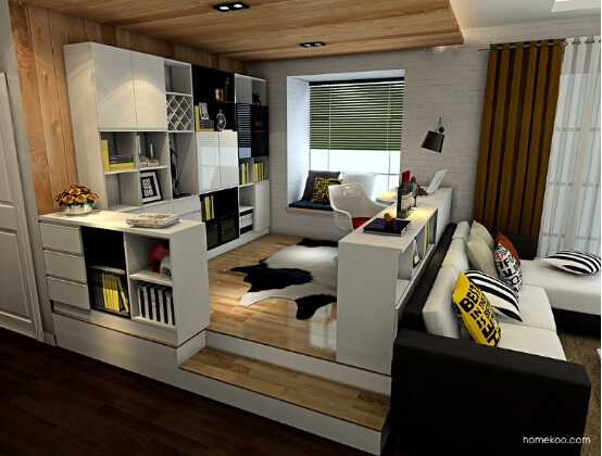 尚品宅配将定制玩转的游刃有余,在地台上设计了L形的书柜,超大的收纳空间:地台既可以用做阅读休闲去,也可以铺上床垫(床垫装修效果图)变成柔软大床。书桌放在地台旁,地台演变成了书桌椅子,巧妙的提升了空间利用率。