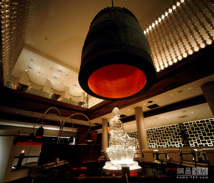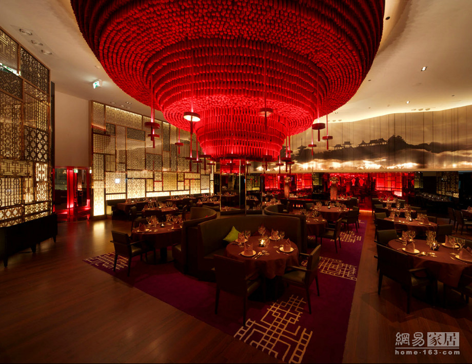 位于卡塔尔首都多哈的中式餐馆,他运用大量红色、水墨画、中国古代服饰艺术品等,营造丰富多元、古色古香的中式氛围。但同时,也利用放大的方式,把屏风放大变成壁面,从地板延伸至天花板。但最让人震撼的是中央的大型天花,用上九千条红色流苏,制作成一个极大的传统灯笼造型。