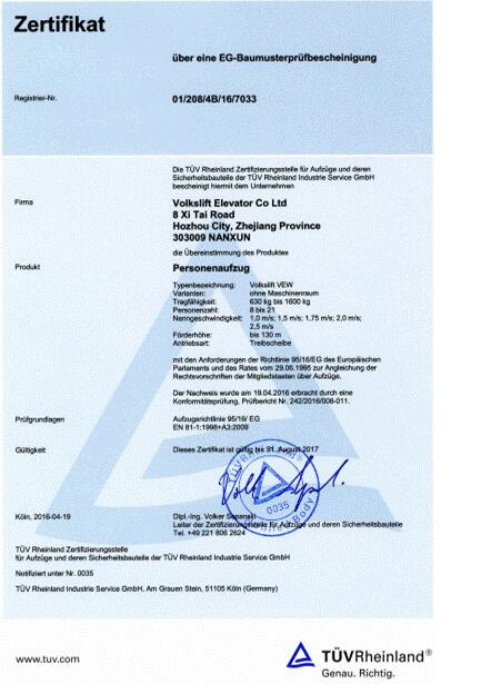 2016年,沃克斯电梯顺利通过了目前被全球公认为最严苛的工业产品安全认证标准——德国TüV认证,并在德国科隆正式颁发证书。德国TüV认证标准在全世界享有极高的声誉,TüV这三个字母是安全、可靠、公正的同义词,一直都是工业制造企业趋之如骛争相追逐的光环。企业一旦通过TüV认证,认证协会将无偿向前来查询的购买厂商推荐其产品,凡取得TüV标志的元器件还可享受免检的优厚条件。高标准造就高质量,沃克斯电梯能够获得这项认证不仅是对产品质量安全的肯定,更是对提升自身品牌形象的一大跨越。