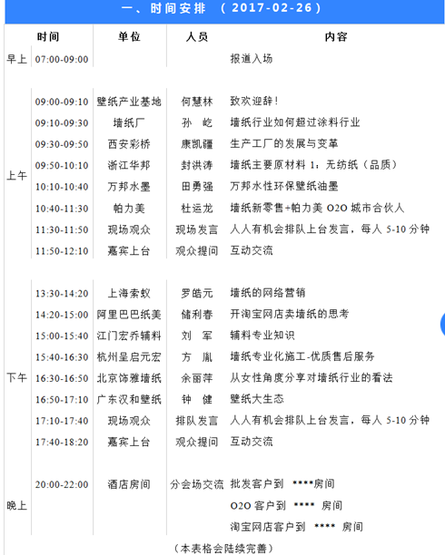 展会前一天2月26号,合肥万户墙纸牵头正在顺义国门酒店召开了第四届墙纸豪杰会,大壮有幸被邀请为豪杰会致欢送辞。客岁八月份上海墙纸展期间的第三届豪杰会大壮也去加入了,但感受结果不是很抱负。本年的豪杰会出乎预料,人气火爆,内容翔实,反应强烈。从下面的会议的日程表能够看出,参会的嘉宾有墙纸工场、墙纸
