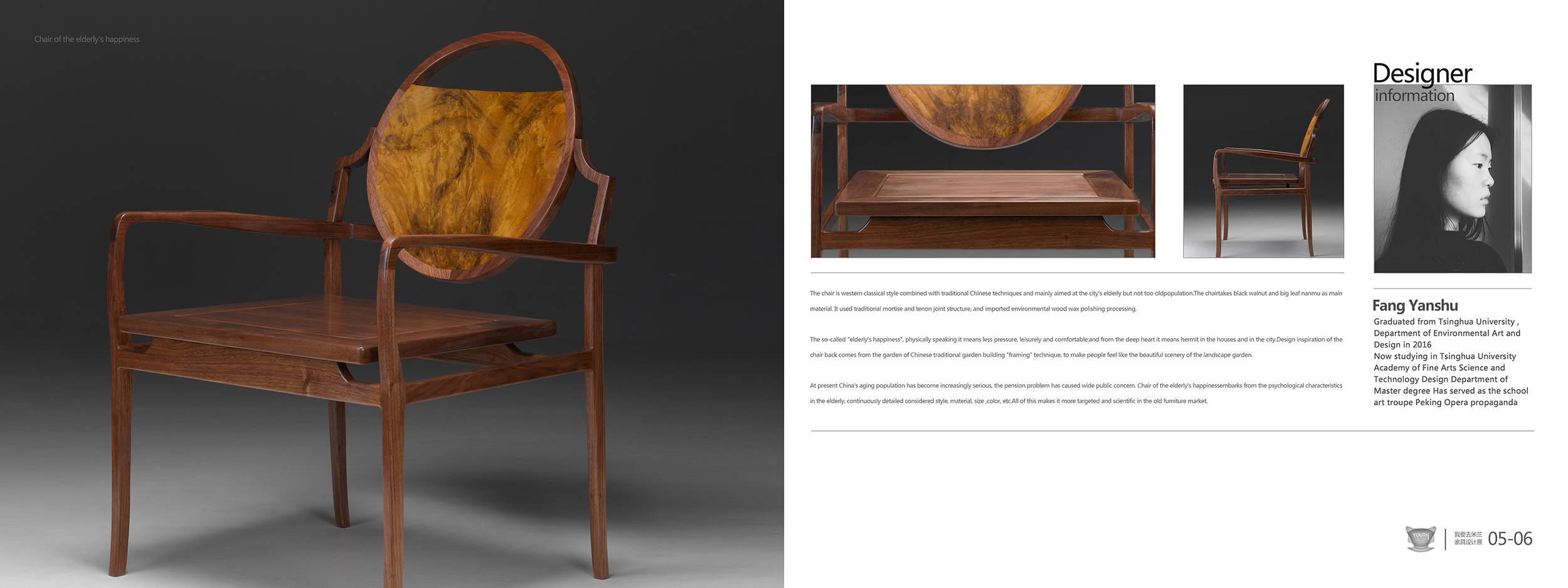 做品设想:次要针对城市中的年轻型老年人人群。的古典气概连系中国的保守手法。采用保守榫卯布局,材质以黑胡桃木和大叶为从,并以进口环保木蜡油抛光处置。所谓老有所“乐”,乐正在于身:卸下压力,闲适; 乐正在于心:归现屋舍,大现于市。椅背设想的灵感源于中国保守园林制园中的“框景”手法,以此让人感遭到仿佛山川园林的夸姣景色。