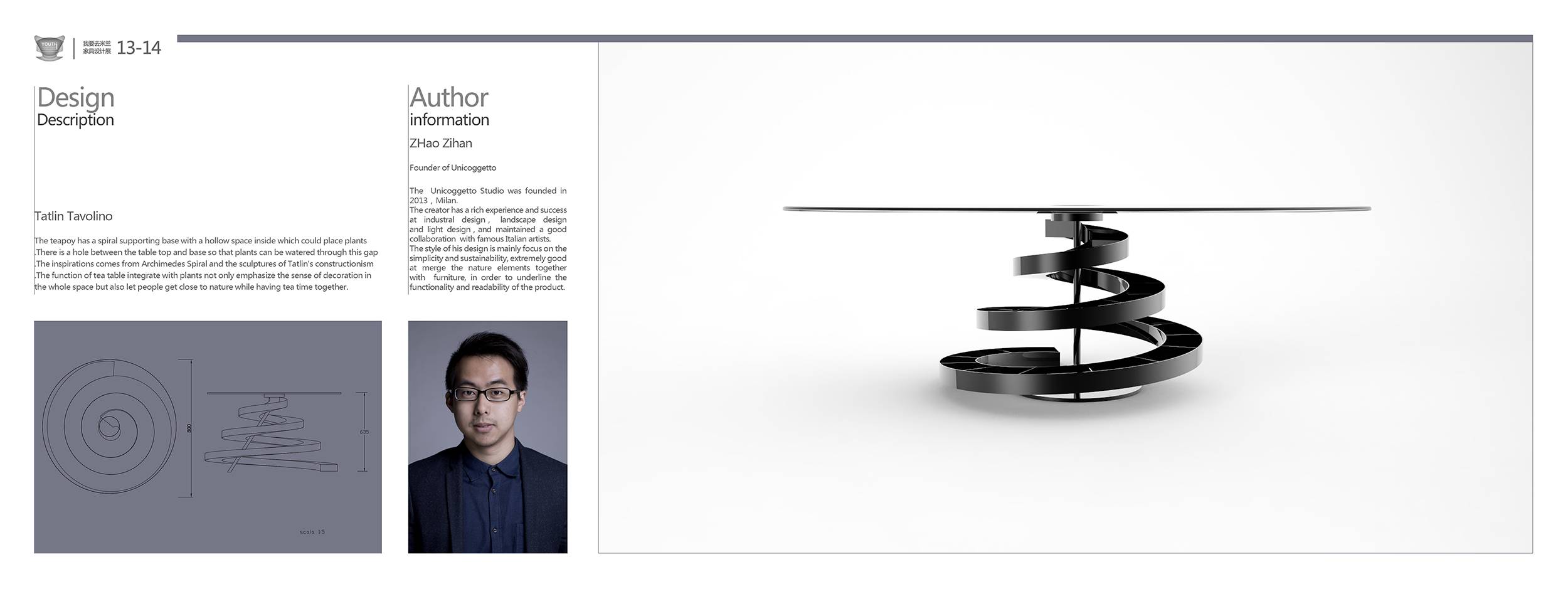 做品设想:桌子底部为螺旋上升制型,且有内部放入动物的凹槽。底部取桌面毗连处有裂缝, 水可通过裂缝灌溉下面的动物。产物概念连系了人取生态,让人们正在歇息品茗间享受天然。 若是水不小心撒正在桌子上,可间接用于灌溉,更是简化了糊口。