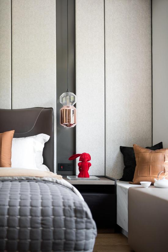 次卧选用monotti 和柏秋纳、poliform 的家具格式凸显低调奢华的质感,室内是全是艺术感的褶皱挂画及雕塑,窗外是碧色幽幽,一幅安好漂亮的适意画卷描画正在立体的空间中,这一切又都取木色构成天然而然的呼应,步入室内,跟着光照角度强弱的变化,人的情感极易获得放松。
