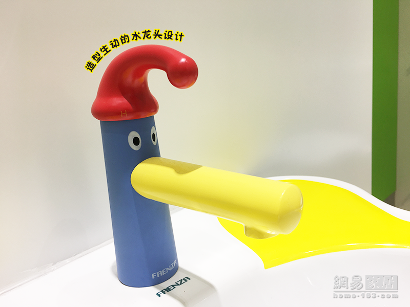 而水龙头的制型更是十分活泼风趣。红、黄、蓝三色的搭配,让卫浴空间更显缤纷;蓝色的水管是头部身体,红色的开关是帽子,的出水口刚好是口鼻,拟人化的设想十分契合孩子们天实烂漫的性格,由此也能看出设想者的十脚存心。