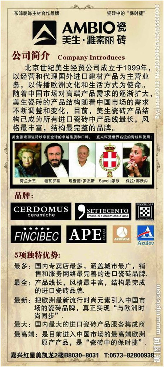 按照美生 · 雅素丽品牌具有者景豪美生经贸无限公司宣传网坐上显示:2000 年,景豪美生经贸无限公司正在中国成功推出了 " 美生 · 雅素丽 " 品牌,成为中国最早成功打制进口瓷砖品牌的公司。AMBIO 美生 . 雅素丽品牌降生于 1999 年,旗下代办署理西班牙 AZULEV ( 雅素丽 ) 、意大利 CERDOMUS ( 希得美思 ) 、意大利 FINCIBEC ( 五星 ) 、西班牙 APE 四个欧洲一线瓷砖品牌。从网坐上消息能够看出,美生 . 雅素丽更像是一个店面的品牌,并非所谓瓷砖品牌,并且从材料上看,吴先生采办这批包拆上印有 "ARGENTA" 字样,但这个品牌也并不正在其代办署理品牌之中。吴先生告诉记者,现在他根基上被搞糊涂了,当初 4 月 7 日去店里选择瓷砖时,发卖人员奉告他 " 美生 · 雅素丽 " 是进口瓷砖,但之后又冒出个 "ARGENTA"。他但愿店家能尽快给他明白回答,事实这批砖是不是进口品牌。