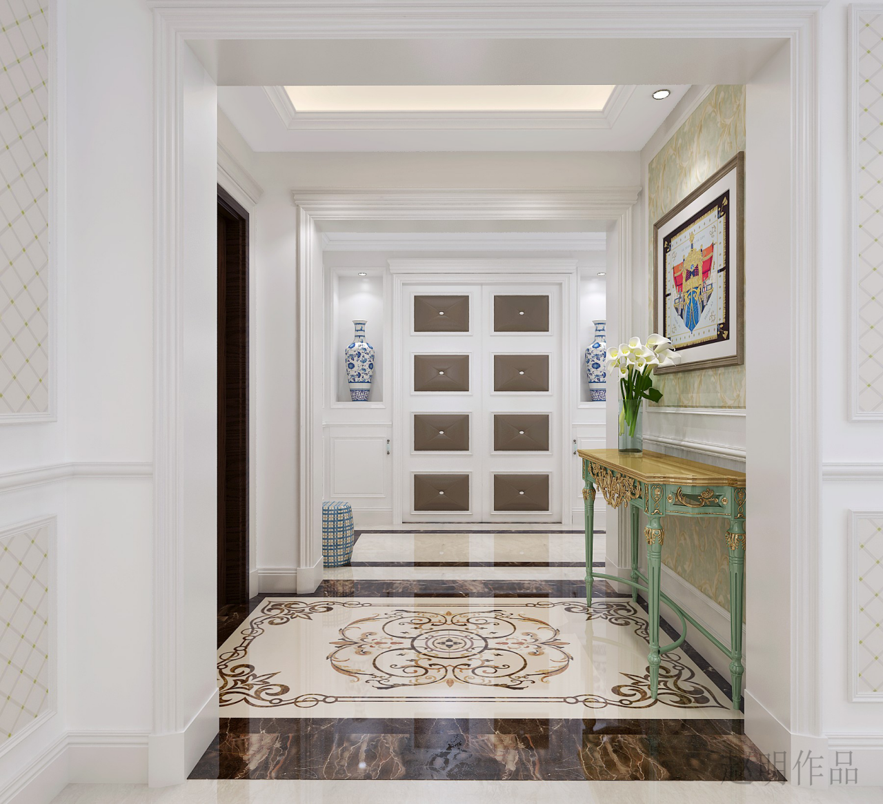 踏入门厅,便被纷杂而来的印象所击中:简单、干净、高雅……纯白色取棕黑色搭配,清洁利落,竹绿色取鹅组合的精美桌子使得空间更具清爽气味。墙柜里嵌着一双青花瓷瓶,相互对称,典雅大气,向入门的每一位客人展现着屋仆人的文雅档次。