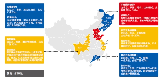 中国度具正在成长成为世界第一大师具制制国的道上,逐渐构成了五大焦点板块:一是以实木家具为从的东北板块取环渤海湾板块,二是以板式家具为从的西部板块,三是欧美家具及出口型为从的长三角板块,四是以软体家具为从的珠江三角洲板块,他们别离占中国度具财产5%、15%、10%、20%、40%的份额,对财产成长具有决定性影响。