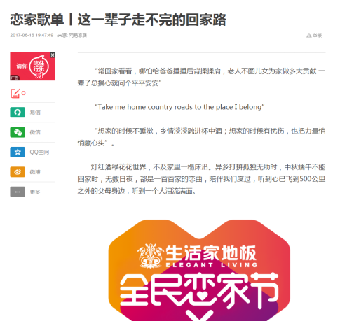 正在恋家节之际,糊口家地板结合网易打制“恋家歌单”,了“恋家单曲搜集令,赢丁磊猪肉”的有,由网友保举恋家歌单50首,而且正在网易云音乐创立恋家歌单专栏——《恋家典范收藏丨这一辈子走不完的回家》。一首首耳熟能详的典范,从头每小我心里对家的眷恋。