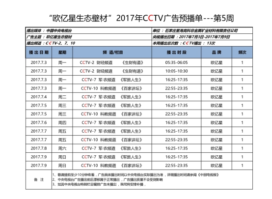 2017年,星海高科公司沉金启动欧亿星品牌央视告白投放计谋,自2017年6月5日起,欧亿星品牌告白,别离投放于CCTV-2、CCTV-7和CCTV-10的《生财有道》、《军旅人生》、《百家讲坛》、《斑斓中国村落行》、《防务新察看》和《健康之》等多个栏目。