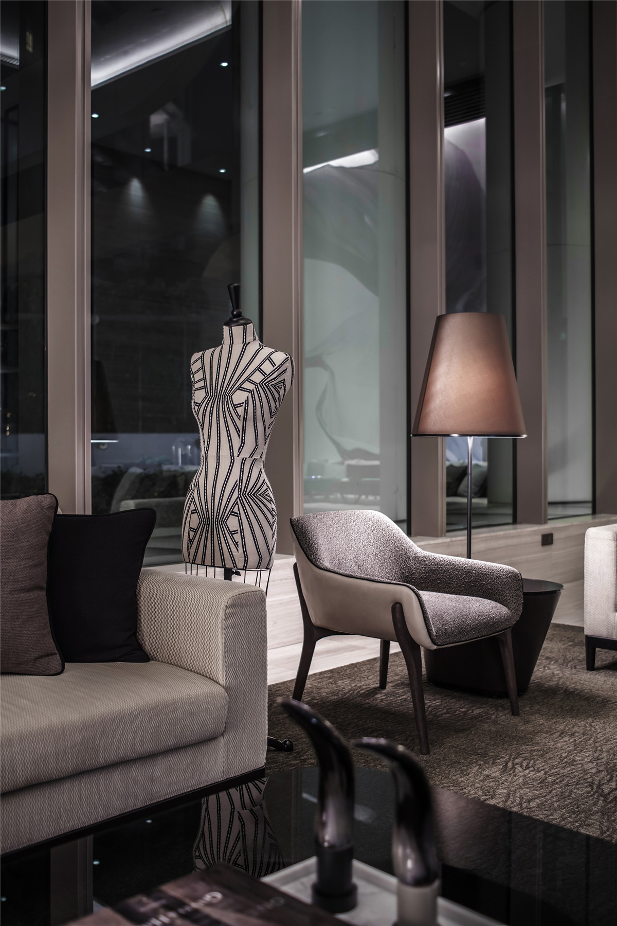 式的欢迎歇息室以巨型深色板条屏风和注目的艺术壁画做定位。散置于酒店各楼层、房间、走廊及公共场合的艺术摄影做品以大型壁画呈现,展示布料或流动或折叠各类文雅形态,为本设想时髦精妙之处。酒店遍地置有时髦配饰及以品牌布料拆整的人形模子。