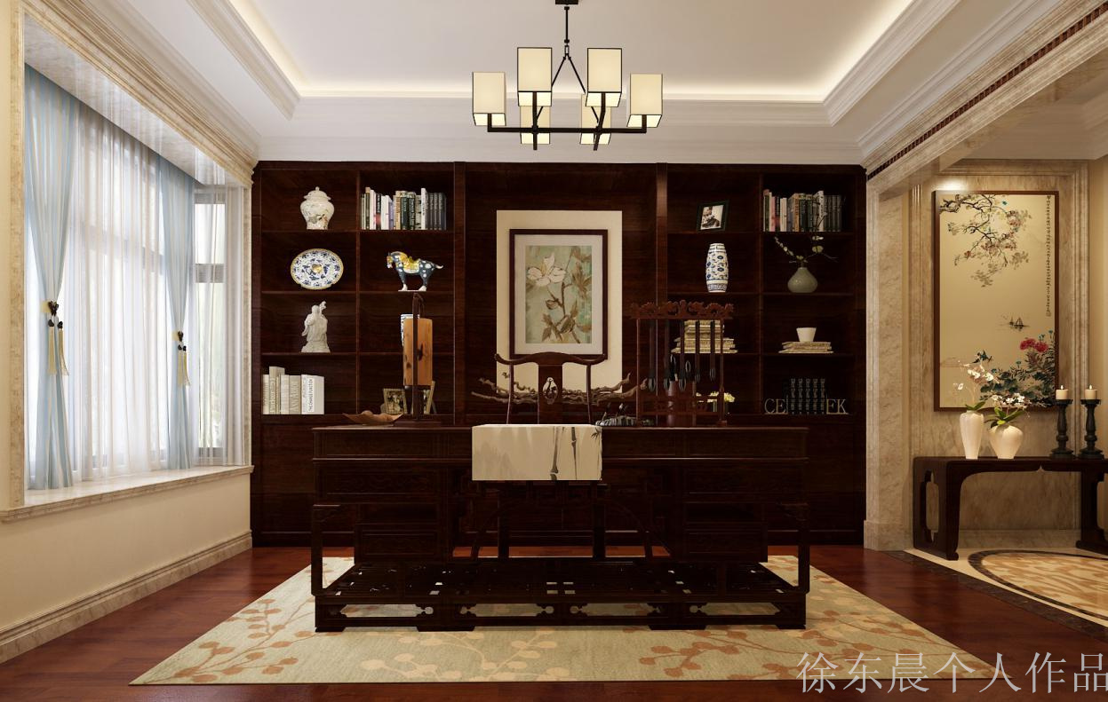 书房采用对称式的结构体例,充实表现出中国保守美学精力。最惹人瞩目的是广大精彩的书架,摆放着瓷器、古玩、册本等等,皆为精雕细琢。正中挂有清爽浓艳的花画,彰显出仆人的文雅格调。窗帘选用浅灰色取白色,添加了纯正取梦幻之感。设想师不落俗套,做立异设想,摸索更适合业从的糊口体例。