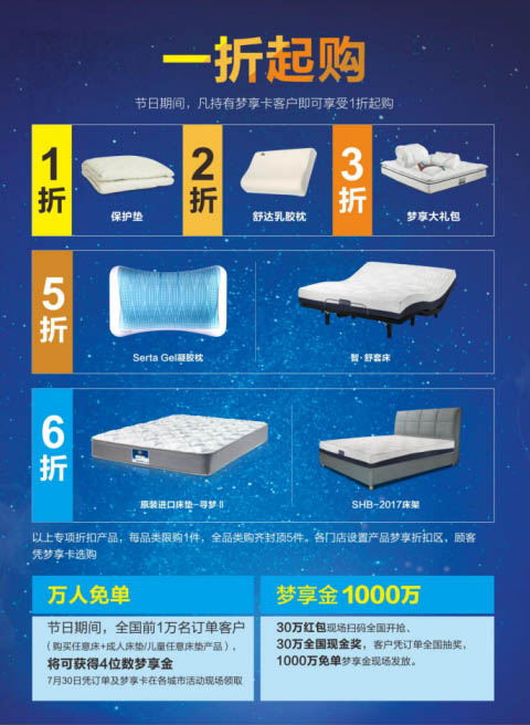 正在期间,为帮更多人实现胡想,舒达沉磅推出“万人免单”。正在期间,舒达拨出1000万梦享金,合适前提客户凭订单抽。全国前10000名订单客户(采办床+床垫/儿童肆意床垫产物),将可获得4位数梦享金。同时,30万红包现场抽取,落地当天全国开抢。