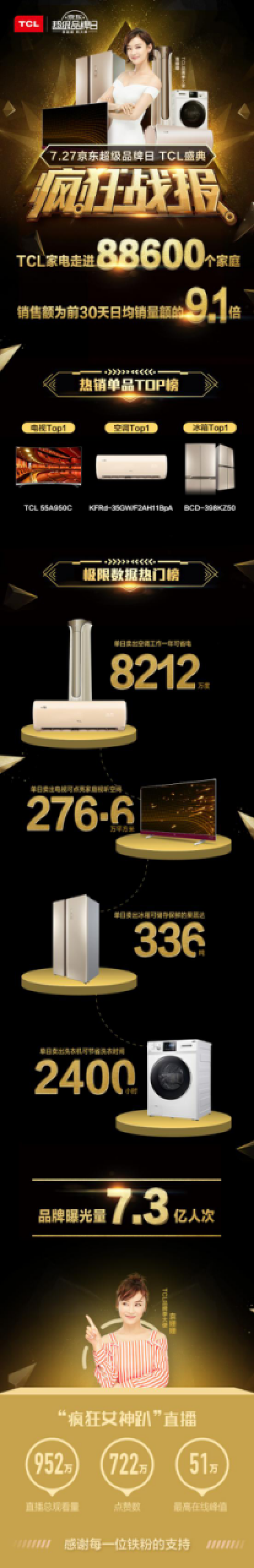 正在明星影响力、KOL力和粉丝传布力的鞭策下,京东超等品牌日TCL盛典的促销消息获得强势。截至曲播竣事,曲播总旁不雅量达952万,点赞数722万,最高正在线峰值达51万。结合TCL正在微信伴侣圈以及北上广深等几大沉点城市的全方位告白投放,实现了高达7.3亿的品牌量,为当天的发卖成功引流。