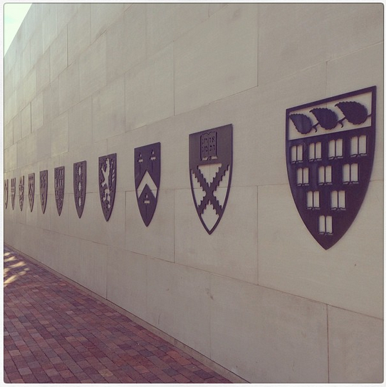 耶鲁大学一共有12个住宿学院,每个学院均有自己的名称以及教职工资源。这样的设定是为了让学生能够感受到小型学院的文化氛围。每个学院均有专属的多彩钢盾设计。上述苹果店使用的钢盾是由耶鲁大学校友 Jonathan Corum 设计的。