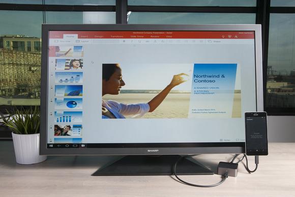 在Windows Mobile 10中有一个名为Continuum的功能,它可以将手机与显示器连接,手机能替代Windows 10电脑。Lumia 950和950 XL可以通过USB-C连接到微软的Display Dock(售价99美元),然后就可以接上键盘、鼠标和显示器了。你还可以通过无线将手机连接到支持Miracast的显示器上,手机就可以当成PC用了。