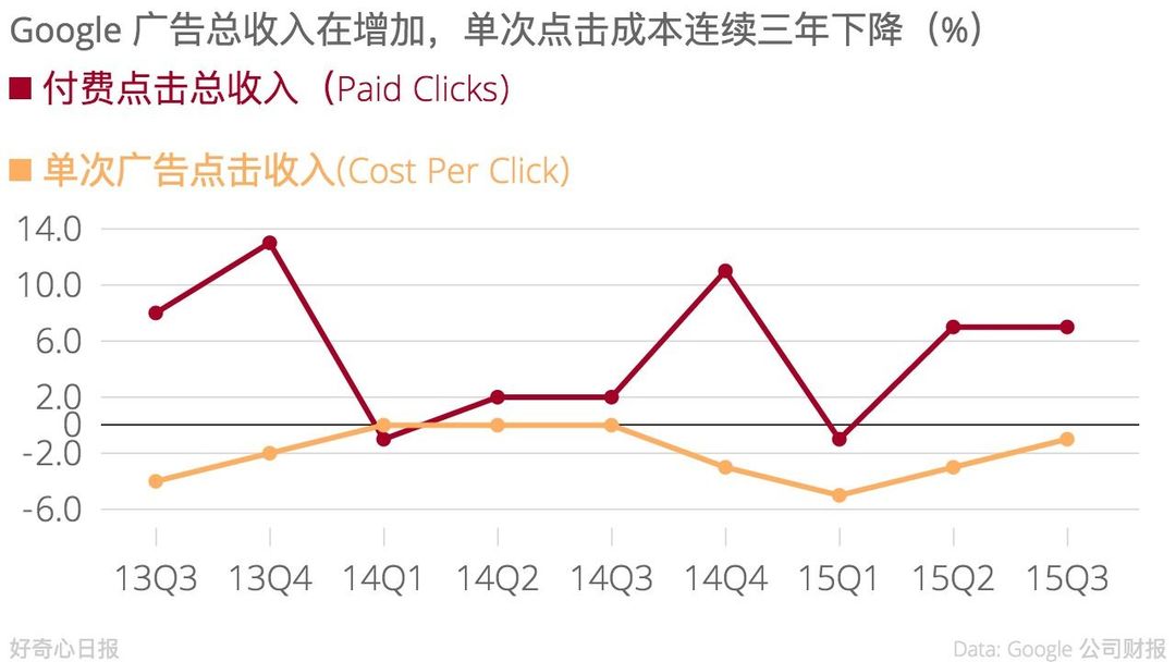 但互联网用户从电脑转向移动之后,对 Google 搜索广告的冲击的影响正在浮现。最直接的体现是 Google 从广告主那里收取的每次点击费用(CPC)在最近三年都在下降。