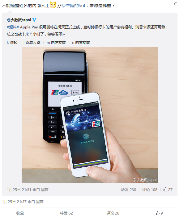 前几天网上曾曝光了一份疑似中国民生银行的内部通知文件,其中显示 Apple Pay 将于 2 月初在国内上线。网友 @少数派sspai爆料称 Apple Pay 很有可能会于明天在国内上线,届时持招商银行信用卡的用户会有福利。在此之前,苹果已经与中国银联发布联合宣布,Apple Pay 登陆中国的时间预计为农历春节之前。