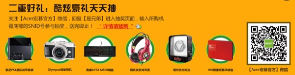 购机用户还享有额外特权,关注Acer宏碁官方微信公众号后,回复是兄弟进入活动页面后,点击我靠装备,输入机器底部的SNID号参与抽奖,每天抽出一名幸运用户。奖品包括索尼PS4星际战甲套装、Olympus微单相机、赛睿Apex M800键盘、钢铁侠游戏耳麦、钢铁侠充电宝、WD限量版移动硬盘等科技单品,让人品爆发吧,超级大奖马上属于你。