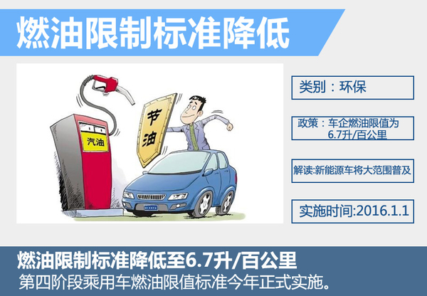 2014年11月1日,工信部等五部委联合发布第三阶段乘用车燃油限值标准实施,根据该标准,到2015年国内生产的乘用车平均燃料消耗量要达到6.9升/百公里。2016年1月1日起,第四阶段乘用车燃油限值标准开始实施,这也是国家为促进先进节能技术的应用和推广,改善气候环境所作出的硬性要求,国内车企所生产乘用车,平均燃料消耗量需降至6.7升/百公里。对于为达到要求的整车企业,将采取加强监管、限产整顿等措施。不难预料,2016年后的国内汽车市场,小排量T引擎、插电混动、纯电动等低油耗甚至0油耗的动力系统将成为主流发展趋势。