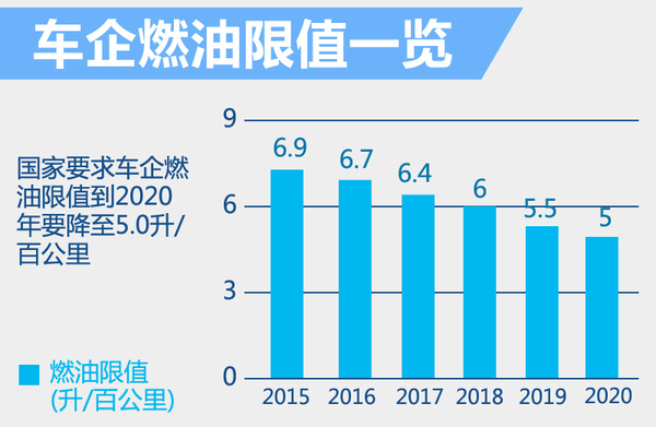 从长远规划来看,按照国家相关规定,到2020年车企燃油限值要降至5.0升/百公里。考虑到企业降耗任务较重,因此这些部门为企业设定了每年油耗达标值,目标由松至紧,从2015年到2020年,工信部为当年生产乘用车设立的平均油耗目标分别为百公里6.9升、6.7升、6.4升、6升、5.5升和5升,其中2016年所要达到的6.7升/百公里对于改善燃油消耗起到重要作用。