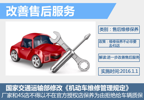 对于此前保修期内如果不在4S店保养,车辆一旦出了故障,4S店有理由拒绝车辆保修的问题,国家交通运输部对《机动车维修管理规定》进行了修改,明确规定了厂家和4S店不得以不在官方授权店保养为由拒绝给车辆质保。该项规定将于2016年1月1日开始实施。