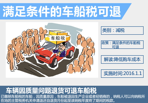 众所周知,在国内购买一辆新车需要缴纳的税,主要涉及进口关税(不包含国产车型)、增值税、购置税、消费税(这些都体现在售价中),以及用车过程中的车船税和除税收之外的保险费、检验费等各种费用。根据国家税务总局发布的《车船税管理规程(试行)》规定,已缴纳车船税的车船,因质量原因,车船被退回生产企业或者经销商的,纳税人可以向纳税所在地的主管税务机关,申请退还自退货月份起至该纳税年度终了期间的税款,退货月份以退货发票所载日期的当月为准。国税机关应当向地税机关提供车辆退货发票信息, 以减轻纳税人办税负担。另外,已完税车辆被盗抢、报废、灭失而申请车船税退税的,由纳税人纳税所在地的主管税务机关按照有关规定办理。