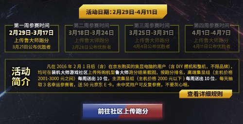 京东商城你装机我出钱,2016集显电脑争霸赛活动地址京东商城你装机我出钱,2016集显电脑争霸赛活动时间为2月29日至4月11日。在活动期内您只要是2016年2月1日以后,在京东购买了组装电脑、京东UPC(即,京东自营组装电脑)以及在京东商城购买散件DIY攒机,并前往京东装机大师游戏社区以你装机,我出钱为标题上传鲁大师综合得分截图以及京东订单截图即可参与评奖,详情请登录活动页:。本次活动奖金丰厚,并分为主流集显组(整机价格2000元以内)1000元京东卡奖励以及高端集显组(整机价格2001-3000元区间)1500元京东卡奖励!与此同时在活动期间,我们每天还会从参与晒单的用户中随机抽取3名,活动,给予50元京东卡的晒单参与奖!