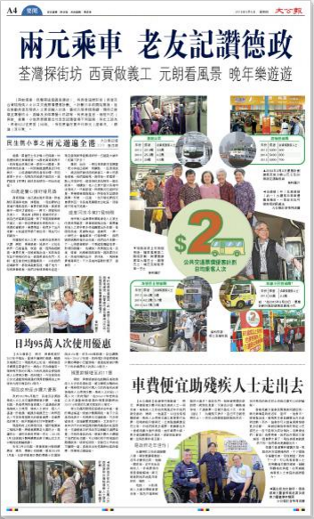 大公网5月5日讯(记者张月琪)两蚊搭车,我觉得这个真是德政!有长者这样形容长者及合资格残疾人士公共交通票价优惠计划。计划三年前开始实施,旨在推动长者及残疾人士更多融入社区,最初只限乘搭港铁,现时已推展至专营巴士、渡轮及多条专营小巴线等,有长者直言,每程只花两蚊车费,令他们更愿意出外走走认识香港不同面貌;有社工认为,长者比以往更爱出街,有的更会在夏天付两元游车河,顺道凉冷气。
