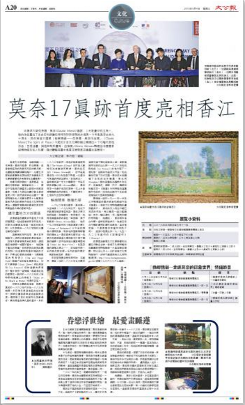 大公网5月4日讯(记者林巧茹、刘毅)印象派大师克劳德.莫奈(Claude Monet)曾说:光是画中的主角。他的作品画出了生命在光线变幻时时刻刻所呈现的永恒美。今年是莫奈去世九十周年,其在港首次个展他乡情韵—克劳德.莫奈作品展(Claude Monet:The Spirit of Place)今起于沙田文化博物馆公开展出。十七幅代表性作品,包括油画、挂毯和粉彩画等,由策展人Bruno Girveau精选自法国国家级博物馆及私人珍藏,藉此体验其画中风景并展现莫奈绘画生涯历程。