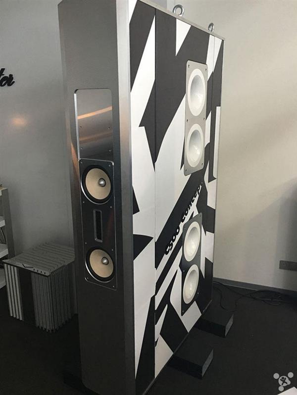负责高频和中频的单元都在设备前部,嵌入在铝合金面板里,整个系统将近两米高,而低音炮则是被放在一个独立的部分,以便旋转。