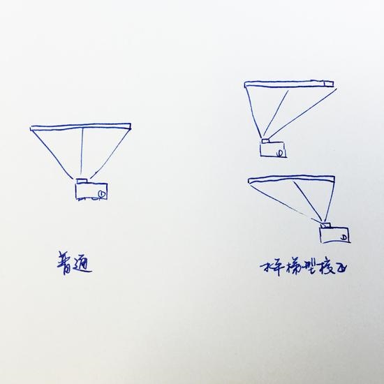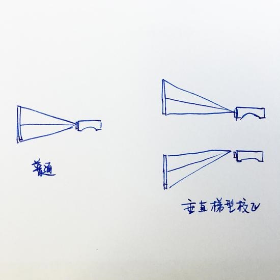 画面校正主要分为调教与梯形校正了。调教很简单,就是在放大缩小画面时,让清晰度都能达到一定水准。而梯形校正如下图,带有这个功能的投影仪基本就不需要特别刻意的摆正了。