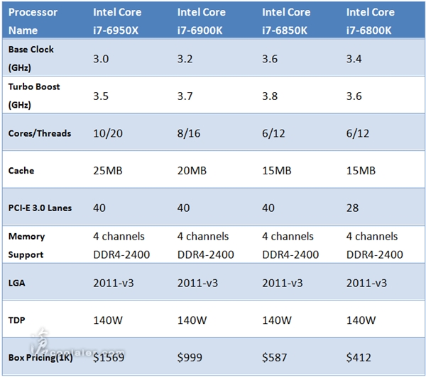 而次旗舰i7-6900K的价格则和目前的旗舰版一样,定价为999美元。