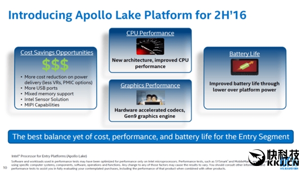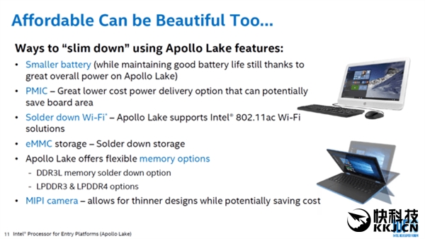 Apollo Lake为14nm工艺,Goldmont架构,设计为双核和四核,性能提升30%,同时功耗优化(6W~10W)使得续航能力提升15%。