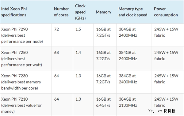 旗舰7290有72个核心288个线程、主频1.5GHz、36MB二级缓存、单/双精度浮点性能超过6/3TFlops、六通道DDR4和多通道16GB MCDRAM高带宽内存(7.2GT/s)、384GB显存、显存频率2400MHz,功耗245W+15W fabric。