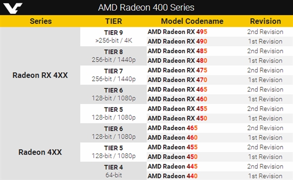X分为九种不同档次,最高的第九档必须满足显存位宽高于256-bit,可流畅运行4K游戏,应该就是RX 490/495。