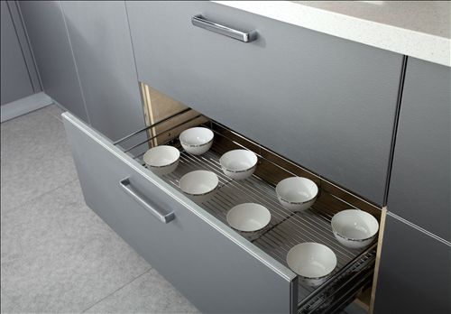 即便是从不开火的厨房,也会有碗碟。碗碟收纳必不可少。如若安装碗碟拉篮,碗碟洗净后,可直接放入,因为拉篮内配置接水的塑料托盘。除此以外,每个碗和盘子都有独立的容身之所,每个碗碟之间都会有铁筋相隔,碗的正面和碗的底面不会有接触更干净更有利于沥干,取拿也更加方便。