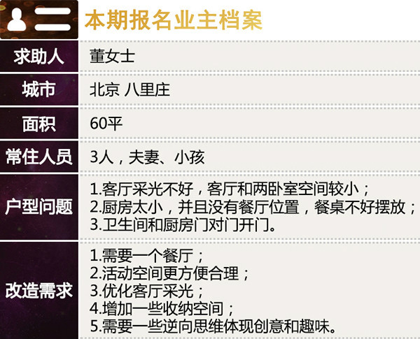 本期改造概述:本期业主是来自北京八里庄的董女士,现一家三口居住在一间60平的二手房中。董女士表示,客厅和两个卧室面积比较小,一家人的活动空间较小,另外也没有餐厅,给他们造成很大的不便。经过详细沟通后,李东郡公益设计师最终为业主提供了两套奇葩房蜕变方案,变实用or变前卫,要不你也帮忙选选?
