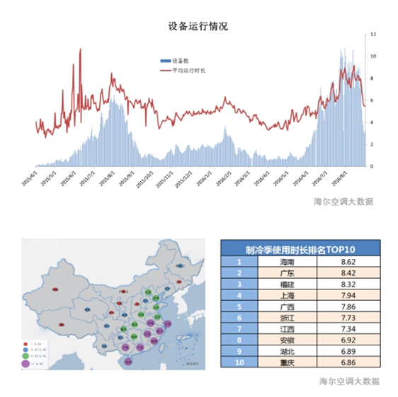 根据海尔大数据平台提供的数据显示,受强大的厄尔尼诺现象影响,天气异常极端。室外气温虽然无法控制,但室内气温却能够很好的进行自主调控。大范围高温天气,使得用户对空调需求激增,年均使用周期和日均使用市场提升显著,成为空调市场增长的关键动力。在海尔空调大数据平台监测的设备中,6-8月平均每台设备的运行时长在5小时以上,相比去年同期每台设备的运行时长有一定的上升。在各省份的运行时间中,海南、广东、福建的运行时间日均超过8小时。