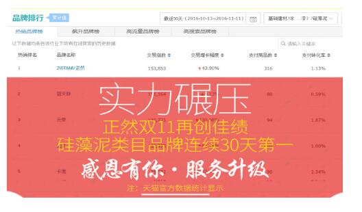 【天猫官方数据:2016年双11后,正然硅藻泥已连续30天霸占销售榜单】