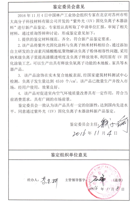 在WDB负离子涂料的新品鉴定会上,中国林产工业协会秘书长石峰将产品鉴定书颁发给WDB涂料品牌负责人淳华先生,这是对WDB涂料在地板科技型涂料上的最大肯定,这也意味着负离子涂料将以涂料界新品类进入地板行业,为地板行业的环保健康起到推波助澜的作用。