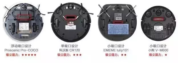 单吸口:单吸口扫地机器人最大的优势是清扫毛发,家里有要宠物和长发妹妹的非常适用。单吸口扫地机器人主要靠吸,如果吸尘电机吸力不够的话,清扫能力就大打折扣。