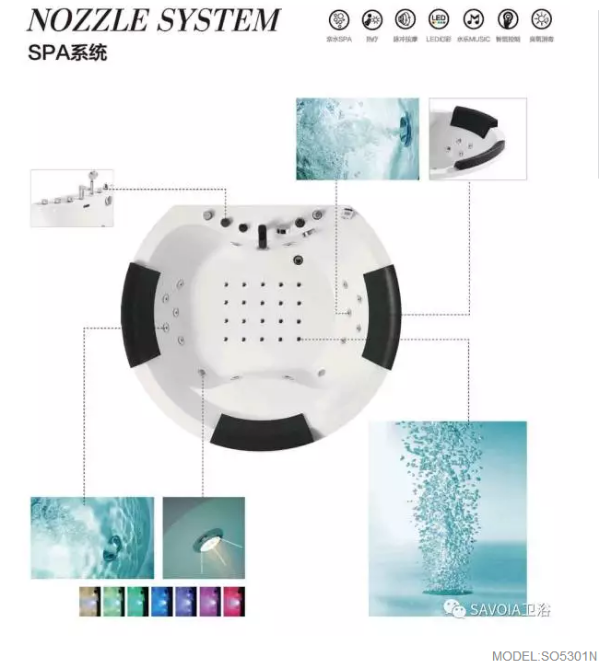 不只如斯,还能够正在舒服地泡澡的同时用音乐放松身心,赛唯雅浴缸还配有动听的声响组件,为您带来一种极佳声乐享受。改安拆完全躲藏于浴缸背后,完全不会影响浴缸的美妙。除此之外,该系统正在有水或无水的下均可利用。只需要通过遥控安拆或者面板就能够选择炫彩灯光或者声乐功能。