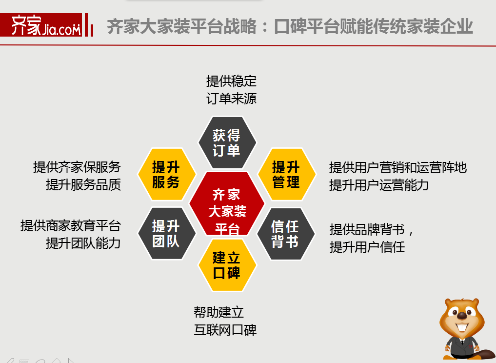 最初我想说一句话,齐家今天正式把平台转型定位成:质量拆修、口碑平台。但愿我们的平台能帮帮实正情愿为口碑付出勤奋的企业,为中国更多靠谱的家拆公司做一些本人的贡献和勤奋,也但愿我们的行业变得愈加靠谱、愈加爱惜口碑。感谢大师!