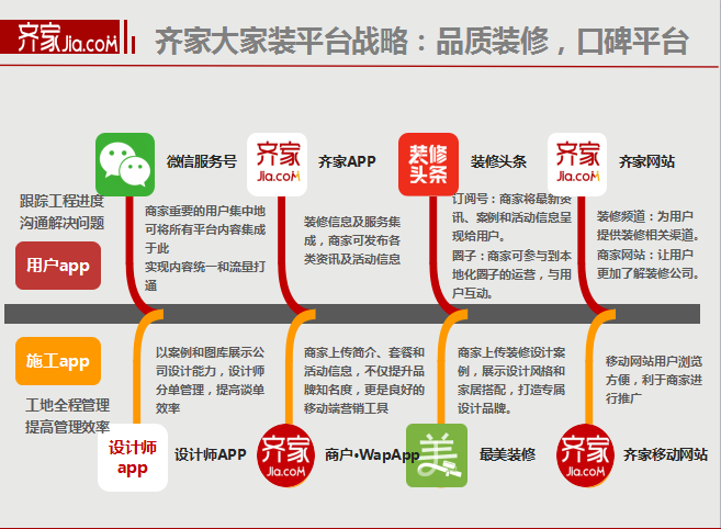 app工程进度,沟通处理问题;施工app进行工地全程办理,提高办理效率。用户app包罗微信办事号、齐家app、拆修头条、齐家网坐。施工app包罗设想师app、齐家商户APP、最美拆修、齐家挪动网坐。
